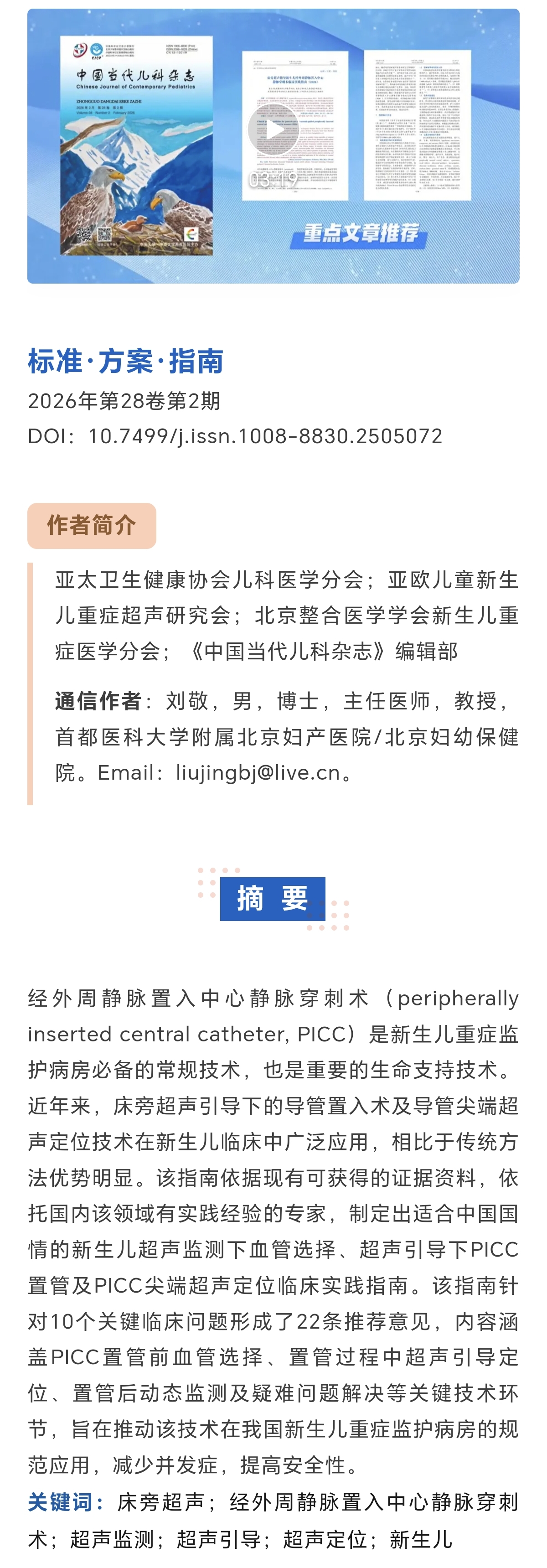 由亚太卫生健康协会儿科医学分会牵头拟定的“床旁超声指导新生儿经外周静脉置入中心静脉穿刺术临床实践指南”在2026年第28卷第2期《中国当代儿科杂志》正式发表。